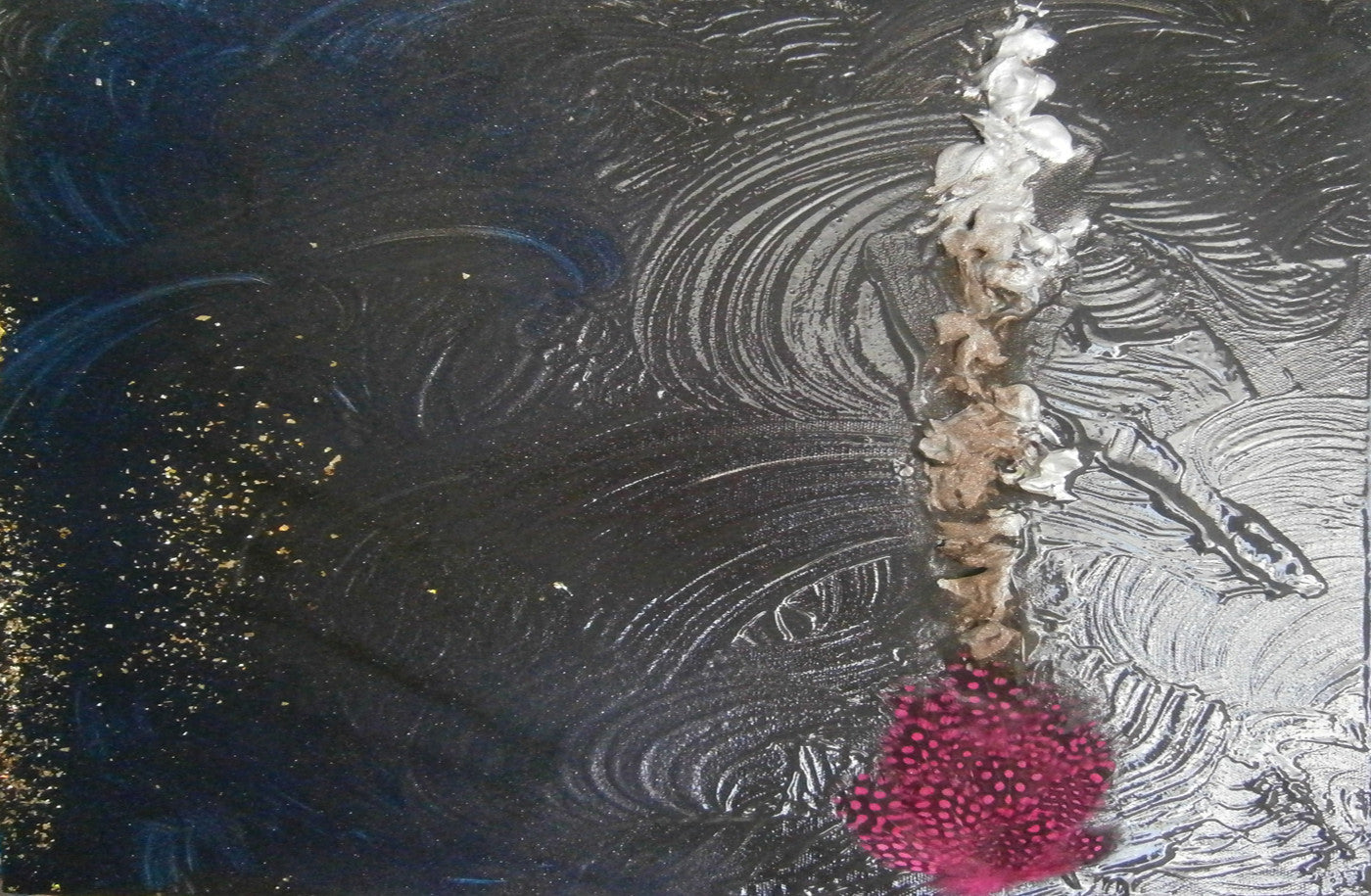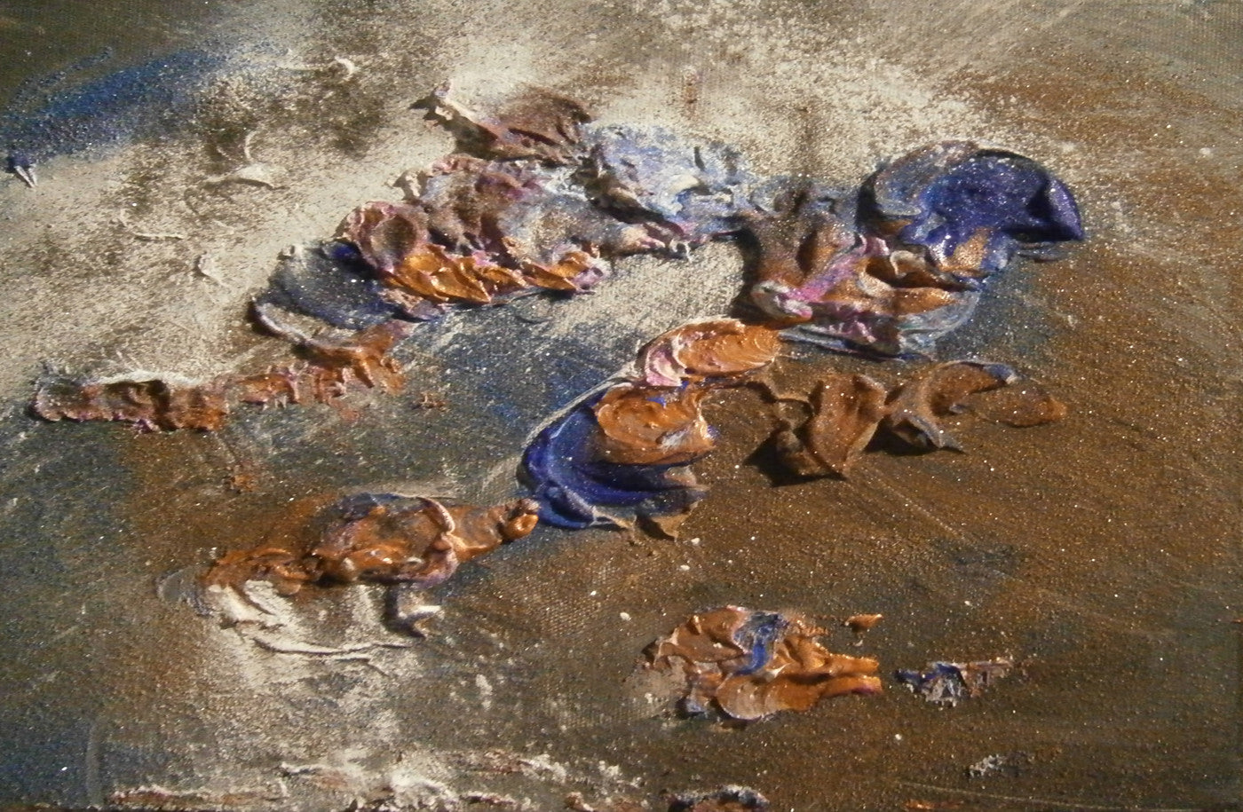 Abstract expressionist painting provides me with the platform to combine the creative efforts of painting and sculpting onto a canvas. I use a range of media in addition to acrylics, including sparkle dust, sculpting clay and at times, freshwater pearls, flax seeds, along with other media, to work with the energy I am feeling and wanting to transmit into an expression our eyes will contemplate. The process I use is also filled with many discussions with my husband, also a creative force, where we talk about depths, shapes and the emotional impact of my works.